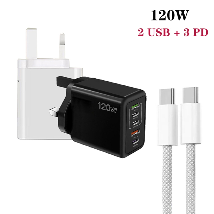 120W PD3.0 3 Type-C 2 USB Multi Port Quick Charger with Type-C to Type-C Cable, UK Plug, UK Plug + C to C Cable