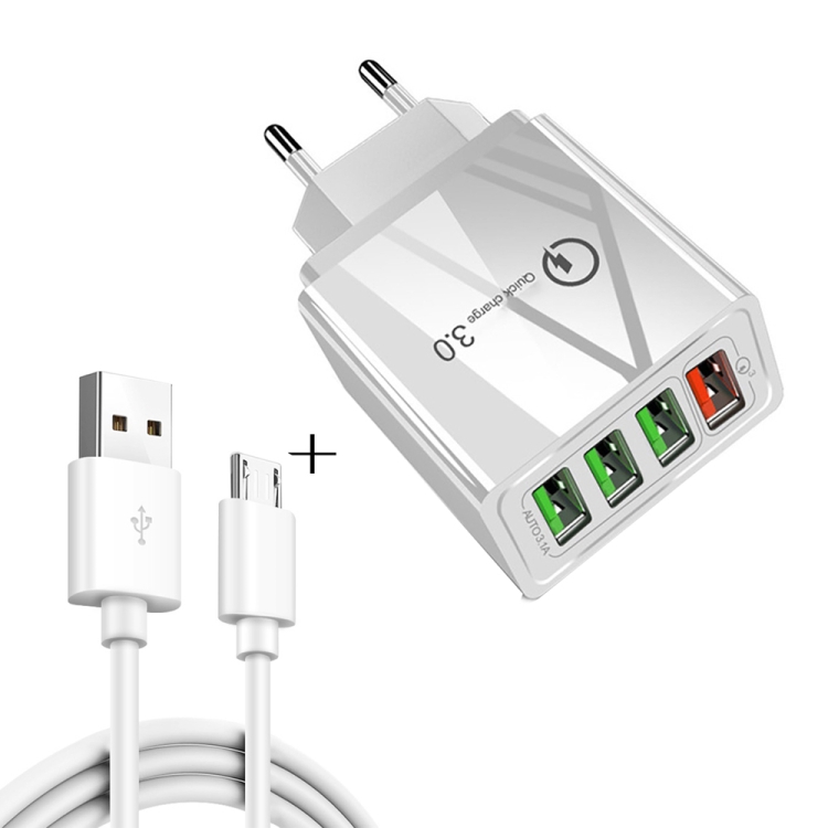 2 in 1 1m USB to Micro USB Data Cable + 30W QC 3.0 4 USB Interfaces Mobile Phone Tablet PC Universal Quick Charger Travel Charger Set, EU Plug, Micro USB Set EU Plug