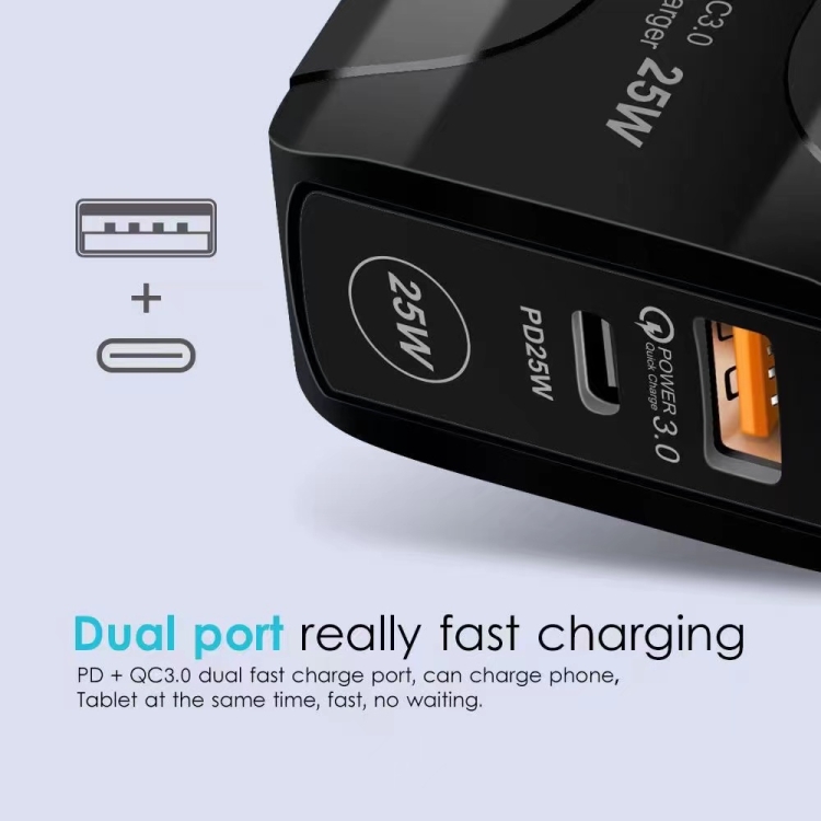 25W PD Type-C + QC3.0 USB Ports Travel Charger, UK Plug