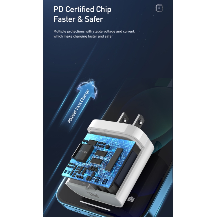 awei PD5 PD 20W Fast Charging Travel Charger Power Adapter with Type-C / USB-C to 8 Pin Cable, US Plug