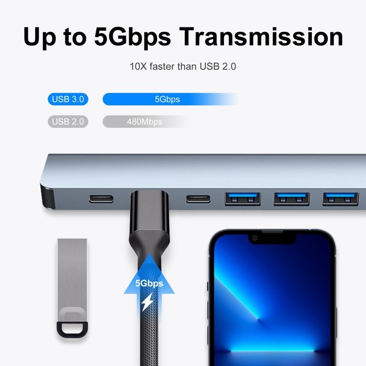 2. 7 in 1 hub, fast data transfer, 1 Port USB 3.0 Hub, 4 Port USB 2.0, Transmission of data without waiting, fast and efficient.