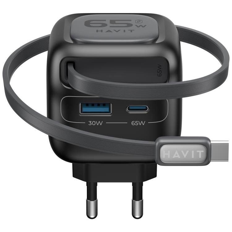 Havit UC253 65W 3 in 1 GaN Travel Charger with Type-C Retractable Cable, UC253(EU Plug)