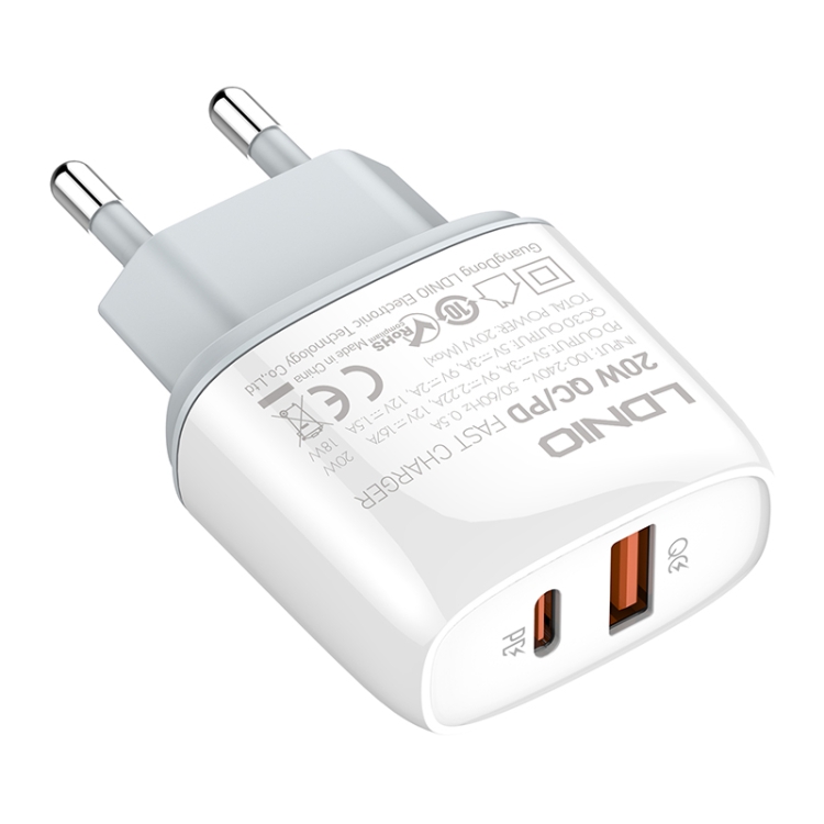 LDNIO Q229 QC3.0 / PD20W USB + Type-C Fast Charger with 1m USB to 8 Pin Cable, EU Plug, UK Plug, US Plug