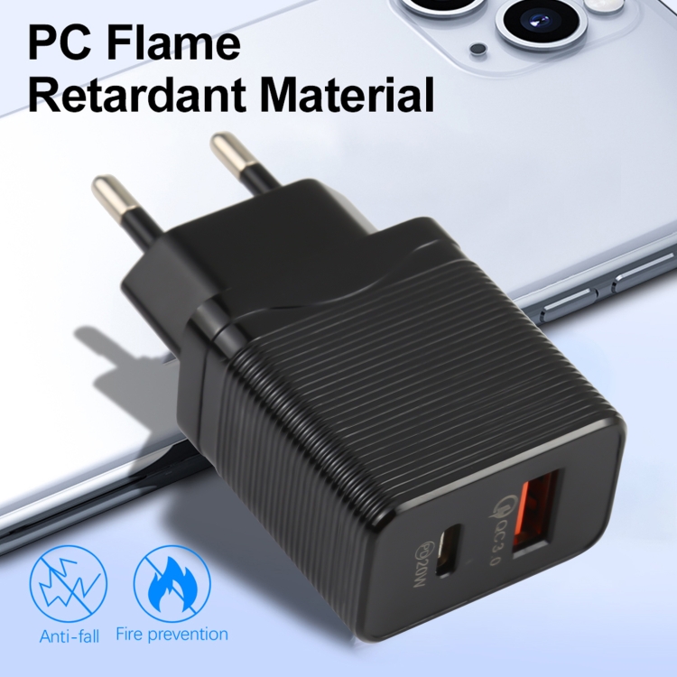 LZ-728 QC 3.0 USB + PD 20W USB-C / Type-C Fast Travel Charger, EU Plug, EU Plug