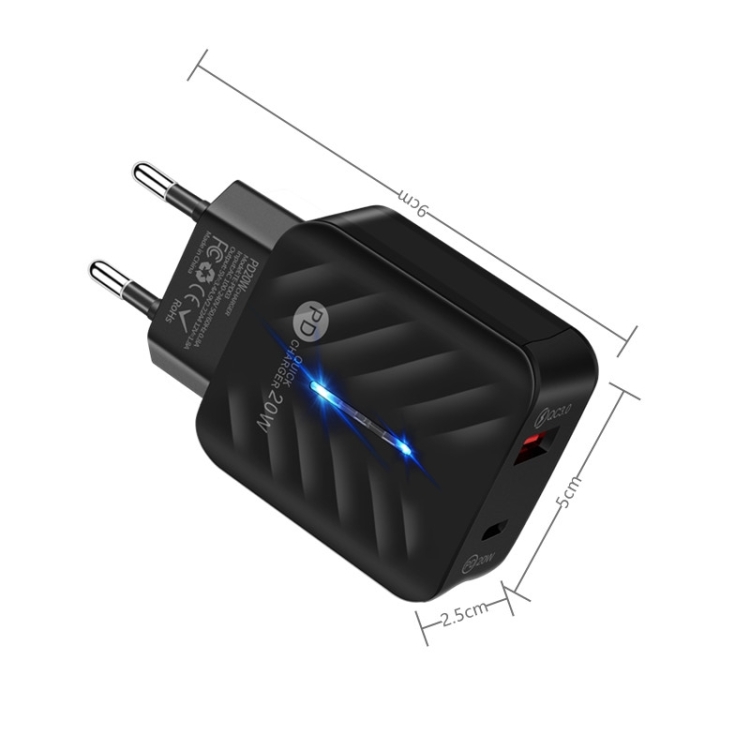 PD03 20W Type-C + QC3. 0 USB Charger with Indicator Light, EU Plug, EU Plug, EU Plug + USB to Type-C Cable