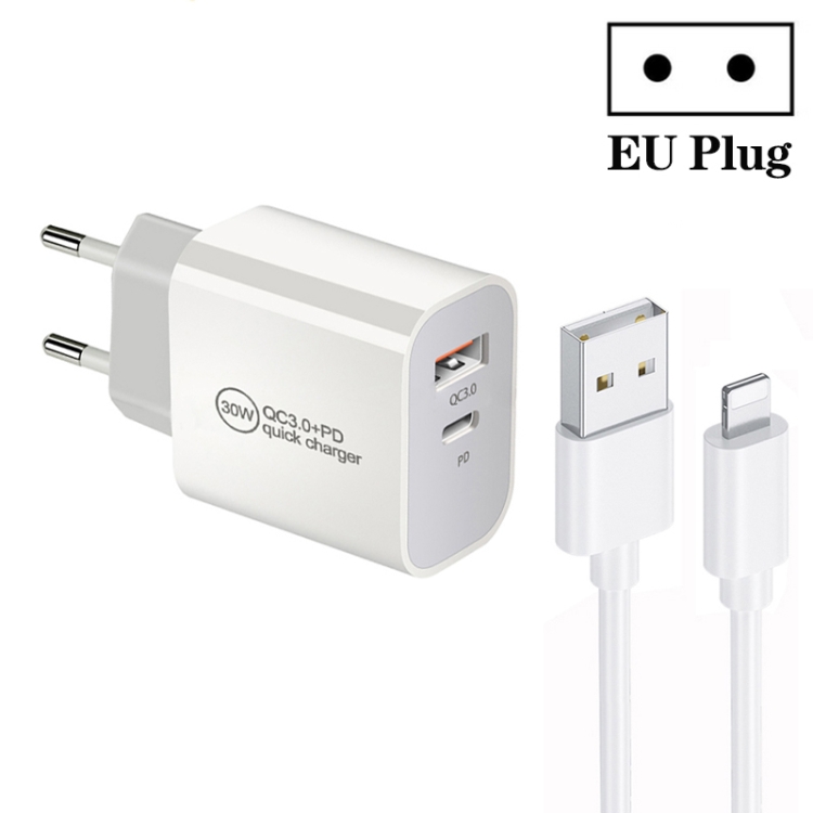 PD30W USB-C / Type-C + QC3.0 USB Dual Port Charger with 1m USB to 8 Pin Data Cable, EU Plug, US Plug, AU Plug